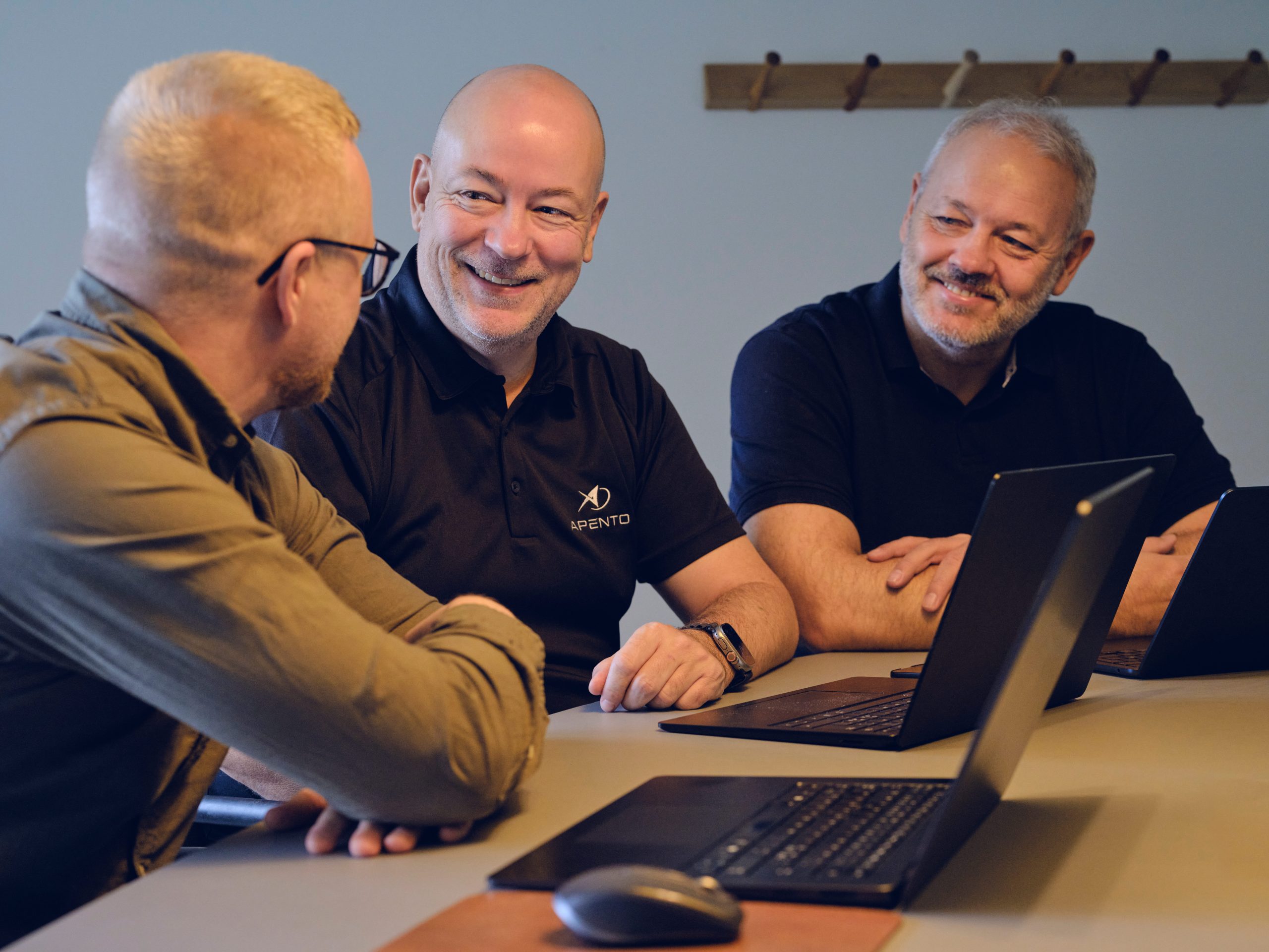 Apento blev stiftet i 2018 af Ronni, Peter og Jens Ole, der alle stadig arbejder som konsulenter i kundernes maskinrum. I 2022 blev Jesper en del af ejerkredsen – eller firkløveret, som vi kalder dem.